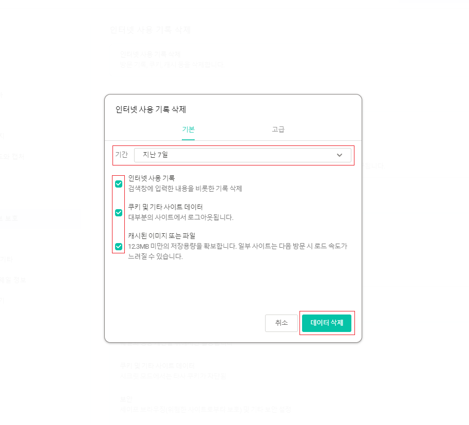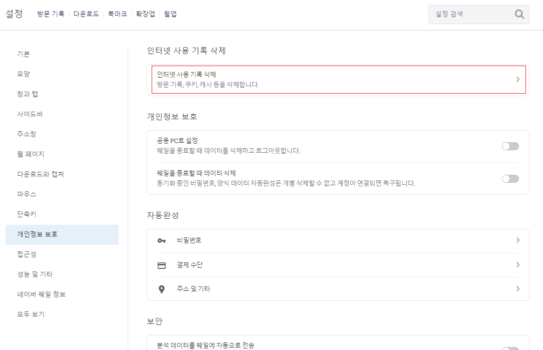 2. 개인정보 보안 > 인터넷 사용 기록 삭제 클릭